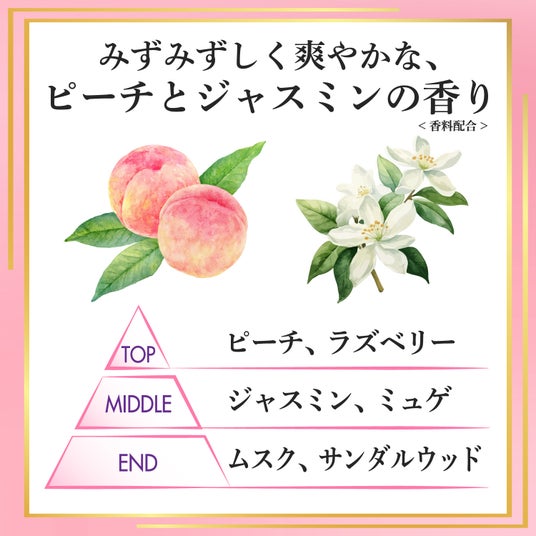 ピーチとジャスミンのほか、ラズベリーやムスクなど、爽やかな香りの組み合わせで構成されています。