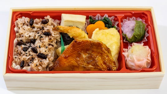 「大」1,399円(税込)=天ぷら(えび、いか、さつまいも)/金目鯛の照り焼き/竹の子焼売 /鶏肉梅味噌焼き/煮物(花形人参、椎茸、高野豆腐、ふき)/厚焼玉子/小松菜のおひたし※/香の物/桜餅/赤飯(160g)