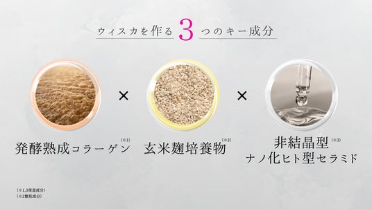 極低分子コラーゲンが肌のハリやキメを整え、豊富なアミノ酸がバリア機能を整え、高濃度セラミドが潤いを保ちます。