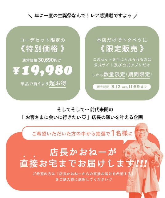 最新トレンドを押さえたおしゃれで機能的な洋服の企画開発・販売を行う有限会社ズーティー(本社:兵庫県神戸市、代表取締役:今石雄介)はこのたび、自身が運営する「イーザッカマニアストアーズ」本店サイトにて、店長「かおねー」こと浅野かおりの3月9日の誕生日を記念して、特別なコーディネートセットを3月9日~12日の3日間限定で販売しています。