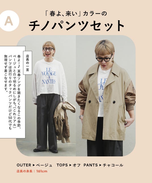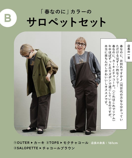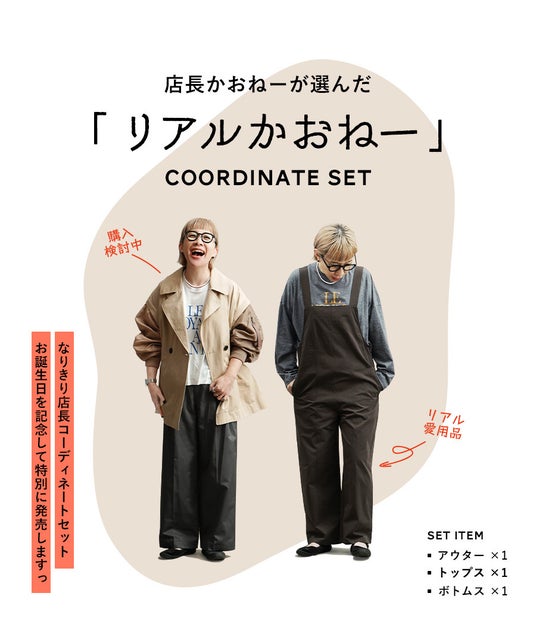 イーザッカマニアストアーズ店長の愛用品と新作を組み合わせた「リアルかおねー」コーディネートセットのラインナップは、きちんとした場面にも使える「チノパンセット」と、おしゃれ度をアップさせる「サロペットセット」の2種類。どちらも店長本人のこだわりが詰まった、まだ寒さの残る3月にぴったりなアウターとのセットで、着回しのきく等身大のコーディネートを提案しています。