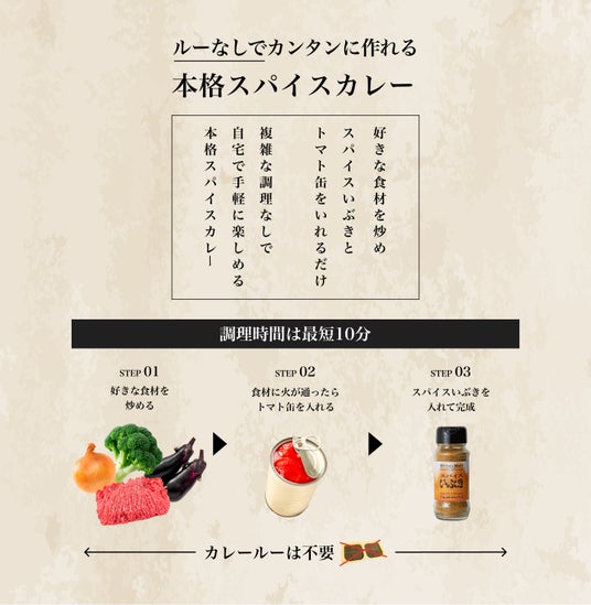 「スパイスいぶき」は15種類以上の厳選スパイスを独自にブレンドし、複数のスパイスを揃えたり配合する手間を解消する万能スパイスです。お好きな食材を炒め、「スパイスいぶき」とトマト缶を加えるだけで、本格的なスパイスカレーがカンタンに作れるだけでなく、どんな食材を使っても味がまとまりやすい設計のため、レシピを見なくても直感的に調理ができます。さらに、カレーに限らず、肉料理やスープ、麺類など幅広い料理に応用できるため、忙しい日々の中でも健康的で満足感のある食卓をカンタンに実現します。