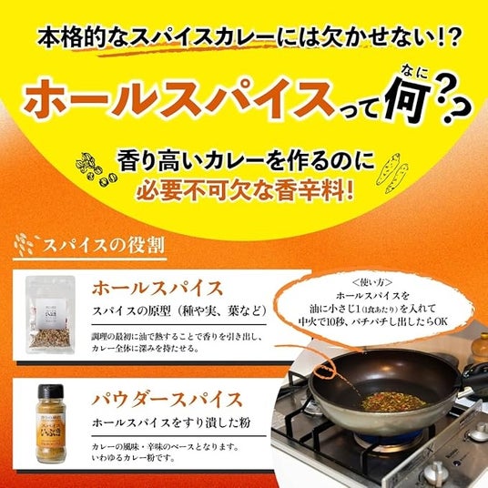 本格スパイスカレーをカンタンに作れるスパイスセットです。セットのホールと合わせて使用することで、口の中で香りが爆発し味が変化し続けるスパイスカレーを誰でもカンタンに作ることができます。