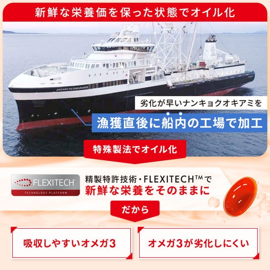 環境汚染の少ない南極の海域で漁獲された良質なナンキョクオキアミを、鮮度を保ったまま船内工場で素早く加工。新鮮な栄養価を守りながらオイル化することで、劣化しにくく高品質な仕上がりに。