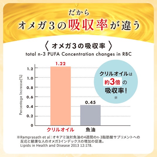 クリルオイルに含まれるオメガ3は、リン脂質(※)と結びついているため、体内での吸収率が非常に高いことが特徴です。そのおかげで、肌や体内でしっかりとオメガ3の効果を発揮します。従来の魚油由来サプリとは異なり、抜群の吸収効率を誇るオイルです。