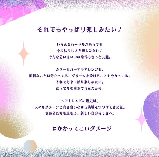 本展示会を通じて、髪のダメージに立ち向かいながら挑戦してきた歴史を楽しんでいただくとともに、髪のダメージを気にせず、さまざまなヘアスタイルを楽しむきっかけとなれば幸いです。