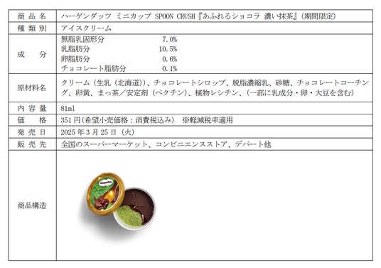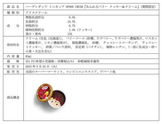 ハーゲンダッツ ジャパン株式会社(本社:東京都目黒区、社長:五十嵐享子)は、ハーゲンダッツ ミニカップ SPOON CRUSH(スプーン クラッシュ)『あふれるベリー クッキー&クリーム』、同『あふれるショコラ 濃い抹茶』を3月25日(火)より期間限定にて全国で新発売します。