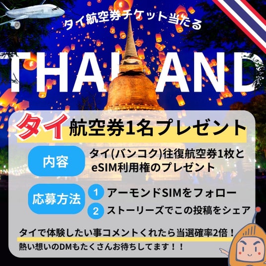 株式会社ビッグコネクト(本社:東京都新宿区 取締役社長:王 曄)が展開する世界中で高品質なeSIMブランド「AlmondSIM」は、Amazon公式Instagramアカウント(@aes.japan)にて、豪華プレゼントキャンペーンを実施いたします。本キャンペーンでは、バンコクへの往復航空券を1名様にプレゼントいたします。
