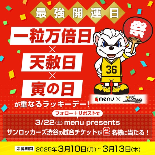 ・応募方法:X(旧Twitter)でmenu公式アカウントとサンロッカーズ渋谷公式カウントをフォロー。menu公式アカウントにて発信されるキャンペーン投稿をリポスト。その場で当選結果がわかります。