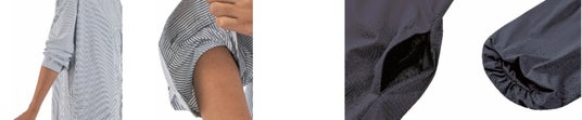 (左)腕まくりしても落ちにくい袖内側の隠しゴム付き (右)サイドにベンチレーションポケットとボリューミーばバルーンスリーブを搭載
