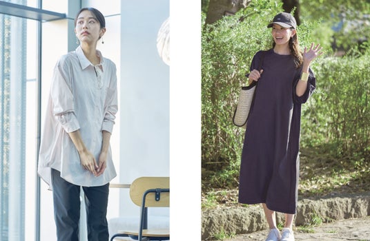 (左)シーンレスチュニックシャツ 税込1780円 (右)DRYサイドポケットバルーンスリーブワンピース 税込1900円