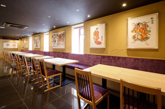 この度のリニューアルでは店内の装飾に、京都の観光名所「伏見稲荷大社」が物語の発端で舞台となる「義経千本桜」を題材とした演目イメージの人物画や隈取図案を取り入れ、伝統と格式を誇る南座との調和を図りました。観劇のお客様だけではなく、国内外のお客様にも非日常の感覚を味わっていただける空間づくりを目指しています。