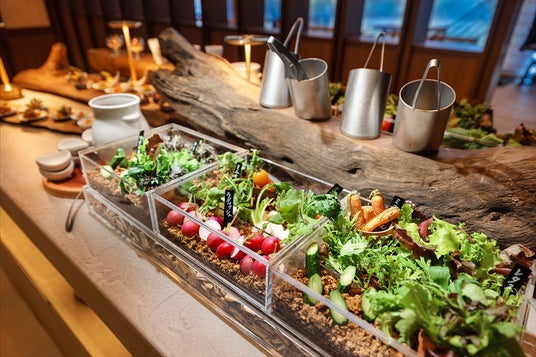 はじめの一皿となる前菜は、農園での収穫をイメージし疑似体験を楽しむ「サラダブッフェ」。メインディッシュは、静岡県富士宮市の創業 100 年を超える老舗精肉店「さの萬」より仕入れています。常に質の高い牛フィレ肉を提供するため、敢えて産地やブランドは決めず、その時々で厳選。お肉とともに供する旬の野菜の滋味深い美味しさもご堪能ください。