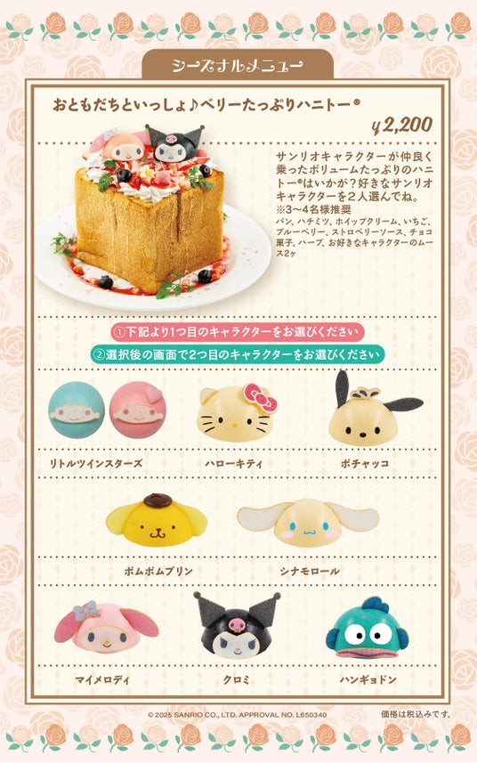 サンリオキャラクターズ ガーデンカフェから、春にピッタリな限定メニューが登場!サンリオのキャラクターのムースが選べるアフタヌーンティーやハニトー(R)などを展開。