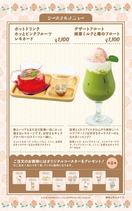 ポットドリンク ホッとピンクフルーツレモネードデザートフロート 抹茶ミルクと苺のフロート(お好きなキャラクターのもなかをお選びいただけます)ランダムコースター付き 1,100円