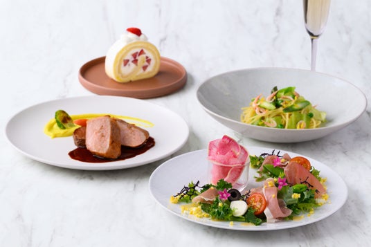 ディナーコースは、国産牛のパイ包み焼きや桜鯛の蒸し焼き、トリュフが香るアランチーニなど、お祝いの日にふさわしい華やかな春の食材を使用しています。ランチコースは、ミモザをイメージした彩り豊かなオードブルや旬の食材を取り入れたパスタ、低温でしっとり火入れしたイベリコ豚ロースなど、軽やかな春の訪れを感じるラインナップをご用意いたします。