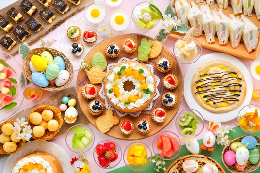 食事会場「Live×buffet ヒカリノモリ」ではカラフルな料理が登場!フルーツパフェやスムージー、イースター限定の自家製スイーツなど、華やかなメニューを多数ご用意しております。
