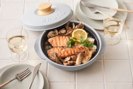 レンジメート プロ バイ ブルーノは、火を使わずに電子レンジで焼き調理ができる「レンジメート プロ」の特許構造*2はそのままに、フタに「BRUNO」のロゴがデザインされた数量限定商品です。色は「ブルーグレー」と、「ホワイト」の2色です。あたたかみのあるデザインで、インテリアや調理シーンにもぴったり。新しい生活を迎える方へのプレゼントにも喜ばれる製品です。