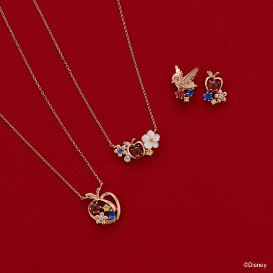 サマンサティアラからは、「白雪姫」をイメージしたリンゴのモチーフが印象的で華やかなデザイン。2種類のネックレスとピアスの3アイテムがラインナップ。