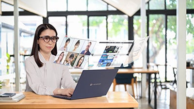 専用アプリケーション「dynaEdge XRワークスペース」をインストールしたPCと「dynaEdge XR1」を USB Type-C(TM)で接続することで、XRグラス上に仮想デスクトップを表示させることが可能。外出先でもマルチスクリーンを活用することができます。