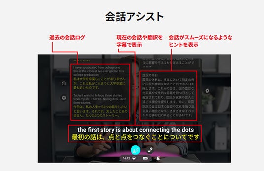 ・会話アシスト:会話の文字起こし、翻訳、会話のヒントなどをAIが多角的にサポート