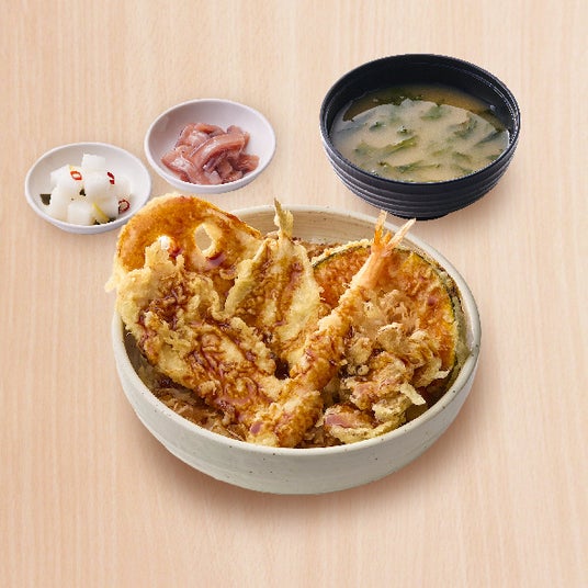 天ぷら6品(海老天・熟とり天・キス天・舞茸天・れんこん天・かぼちゃ天)をあつあつのご飯にのせた彩り豊かな天丼です。味噌汁付き。