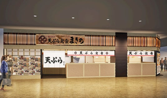 この度リニューアルオープンする 「天ぷら定食まきのイオンモール大阪ドームシティ店」は、2019年4月にオープン後、多くのお客さまにお越しいただき、主にランチの時間帯は行列の絶えない人気店です。この度、より多くのお客さまにご来店いただけるよう、店舗面積を拡張し、カウンター席5席、テーブル席38席、全43席に増席(リニューアル前より11席増席)。また、外壁を少なくすることでより開放的な空間へとリニューアルしました。さらに、セットメニューも新たに増やし、定食や蕎麦・うどんとのセットメニューなど、豊富なメニューをご用意しています。店舗限定の新商品『まきの天盛り2枚せいろ』(税込1,870円)は、天ぷらの盛り合わせに、せいろ蕎麦とうどんの2枚がついたボリューム満点のお得なセットで、お一人でも、ご家族でシェアしてお召し上がりいただくのもおすすめです。他にも、海老天や熟とり天、舞茸天など天ぷら6品の盛り合わせがついた『まきの天ぷら定食』(税込1,320円)や、『彩り天丼』(税込1,320円)など、定番の人気商品もご用意しておりますので、ご家族やご友人同士など、みなさまのご用途に合わせてご利用ください。