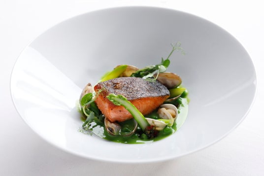 桜の季節に水揚げされ、成熟すると淡い桜色に染まることから名付けられた「サクラマス」。その風味を最大限に引き出すため、皮目をあえて残して香ばしく焼き上げました。しっとり柔らかく甘みのある身と、カリッとした皮の食感をお愉しみいただけます。グリンピースと蒸しあさりの旨みを生かしたソースに、グリーンチリとニンニクをアクセントに加え、オリエンタルな味わいに仕上げました。