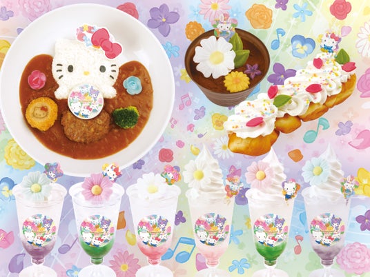 期間限定メニューでは、春らしい色鮮やかなメニューが登場します。お花のウェハースをトッピングした『キティのフラワーカレー』が登場。お子さまも食べやすい甘口カレーとなっています。そのほかティラミスを植木鉢に見立てお花のチョコなどをトッピングした『植木鉢風フラワーティラミス』や、たっぷりのホイップに花びらチョコやリーフチョコをトッピングした『フラワーツイストドーナツ』、ローズ・ラベンダー・ミントの中からお好きな味が選べる『フラワーソーダ』・『フラワークリームソーダ』もお花をトッピング。限定メニューをご注文のお客さまにはノベルティもプレゼントします。