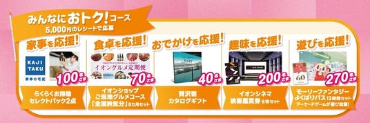 趣味を応援するイオンシネマ映画鑑賞券や、食卓応援として通販サイト「イオンショップ」のご当地グルメなど、生活の様々なシーンを応援するおトクな景品計5コースから選んで応募いただけます。