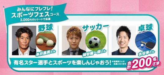 有名スター選手とスポーツを楽しめるコースです。野球の糸井嘉男さん、サッカーの柿谷曜一朗さん、卓球の水谷隼さんの3コースから選んで応募できます。