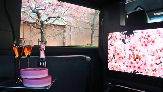 このような背景を受け、「TOKYO CHAUFFEUR SERVICE」から都内の桜名所を最高級車両のLMで巡る「SAKURA RIDE PLAN」をご用意しました。車内では、ビールやシャンパン、桜のお菓子やおつまみをオプションで提供するほか、座席前の大型ビジョンで桜をイメージした映像を放映し、移動中から桜気分を味わうことができる空間にデザインしています。また乗車した方限定で桜仕様の乗車記念証を配布します。