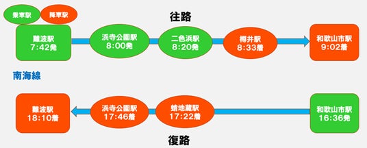 例:(往路)難波駅乗車→和歌山市駅降車 (復路)和歌山市駅乗車→蛸地蔵駅降車