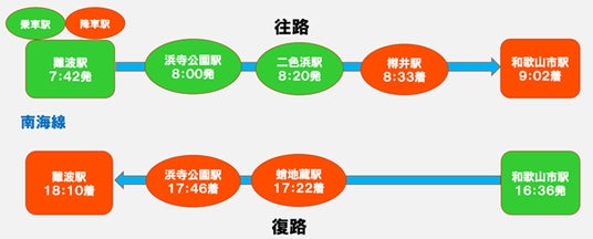 【復路】和歌山市駅(16:36発)→蛸地蔵駅(17:22着/17:23発)→浜寺公園駅(17:46着/17:47発)→難波駅(18:10着)