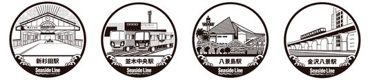 左から新杉田駅、並木中央駅、八景島駅、金沢八景駅 その他のスタンプデザインは取得後のお楽しみ!
