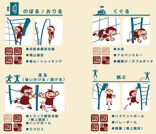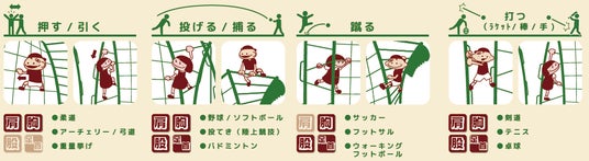 製作所(本社:香川県)が、子どもの発育発達学に基づき、多様な動きが発現するようにデザインしました。また、幼少期に体験しておくことで運動能力が高まる「12の基本動作※」が発現しやすいように考えられています。それらの動作とスポーツ動作とを紐づけることで、将来どのスポーツを選んだとしても身体が円滑に動けるように、と願いも込めてあります。
