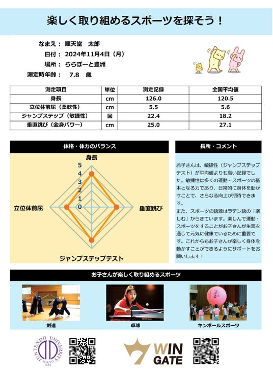 概 要:体格(身長)+3種目の体力測定の結果から、楽しく取り組めるスポーツ3つを提案します
