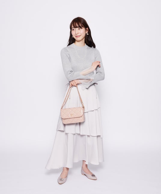 繊細な輝きを放つキラキラツイードが、シンプルになりがちな印象を華やかに演出。薄めでコンパクトなサイズ感に調整し、ロゴを上部に配置することで、重心が下がりすぎずバランスの取れたデザインに。