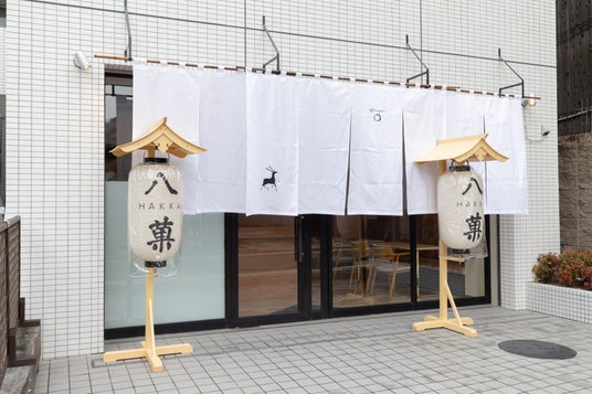 「八菓」の店舗前には、美しい暖簾と特大の提灯が飾られ、京都の風情ある街並みに溶け込み、優雅で温かみのある雰囲気を演出しています。これらのデザインが、訪れるお客様に八菓の世界観を一層引き立て、店内への期待感を高めています。店舗の外観は、白い提灯とのれんが迎えるシンプルでエレガントなデザインで、京都ならではの落ち着いた魅力を感じさせます。