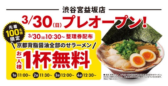3月31日(月)の「渋谷宮益坂店」のグランドオープンを記念し、30日(日)に先着100名様に限り京都背脂醤油全部のせラーメンを無料にてご提供いたします。