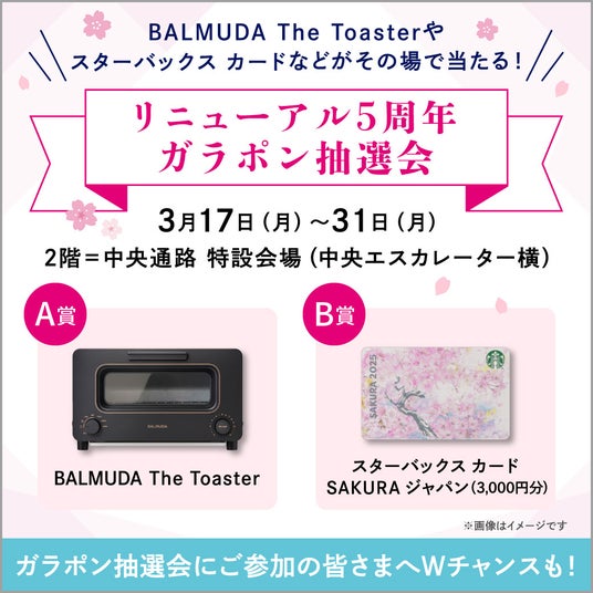 会期中、対象売場にて税込2,000円以上(合算可)の当日お買いあげレシートをお持ちのお客さまは、BALMUDA The Toasterやスターバックスカードなどが当たるガラポン抽選会にご参加いただけます。