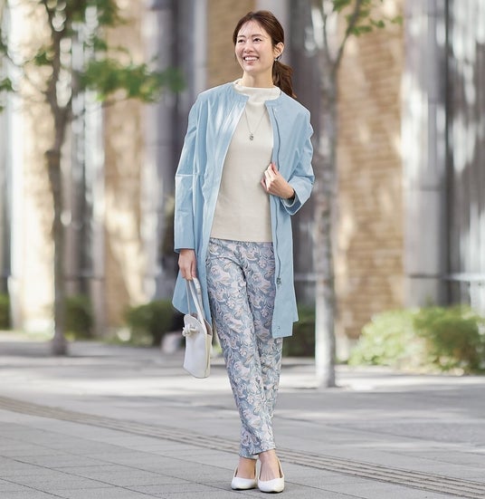 すっきりとしたノーカラーがポイントのフロントジップアップコート。淡いブルーで大人っぽく春を彩ります。