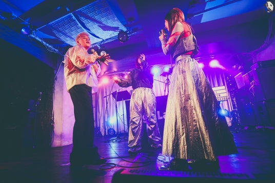 温かな拍手に導かれるように、ステージに姿を現したメンバー。アイコンタクトを取りあい、スゥッとブレスを取ると「654643 A Cappella」を導いた。アカペラで紡がれていく美しいハーモニーは、まさにNagie Laneの真骨頂。それぞれの呼吸を捕まえて、舞台上で声を重ねる時間を愛しむように、歌声を響かせていった。「イケナイフタリ」からは、トラックに乗せて歌うスタイルにチェンジし、一気に華やかな雰囲気へ。mayuがキラキラ成分を振りまけば、mikakoはグルーヴィーな節回しで魅了、barattiは絶妙な按配で楽曲を彩っていく。彼らが生み出す空気に乗せられたのか、自然と左右に揺れたり、クラップをしたりするオーディエンス。LIVE STUDIO LODGEの隅々まで、音楽の波が心地よく広がっていることを感じさせた。