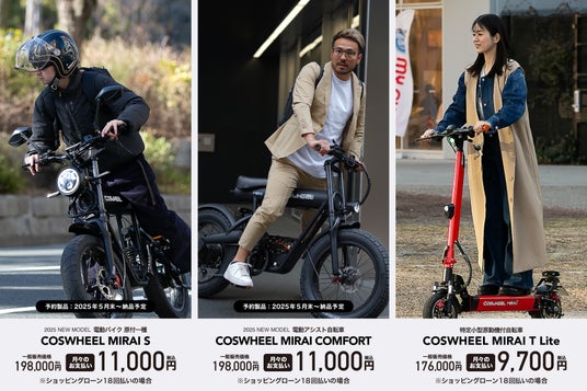 COSWHEEL MIRAI 2025年Newモデル(電動バイク/電動アシスト自転車)は、2025年1月10日(金)12時から予約販売を開始し、受付から約30分で売上5,000万円以上、販売台数500台以上を突破。2025年2月末時点で両機種の累計販売台数1,500台以上の人気機種です。