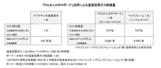 パーム油の原料となるアブラヤシは収穫期を終えると、その廃材の多くが農園内に放置され、腐敗・分解が進みます。その際、メタンガスを含む温室効果ガスを排出することが問題視されています。(メタンガスはCO2の約25倍の温室効果があるとされている) そこで、パナソニック ハウジングソリューションズ株式会社は、独自の再生ボード化技術によりアブラヤシの廃材を活用した再生木質ボード「PALM LOOP(R)ボード」を開発しました。この「PALM LOOP(R)ボード」を、ベッドやテーブルなどの家具に使用することで、廃材を放置して発生するCO2を含む温室効果ガスを削減することができます。