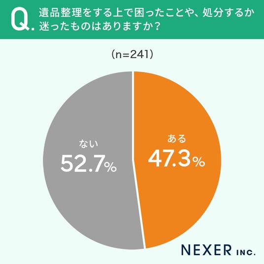 【遺品整理経験者に調査】47.3%が、遺品整理をする上で困ったことや処分するか迷ったものが「ある」