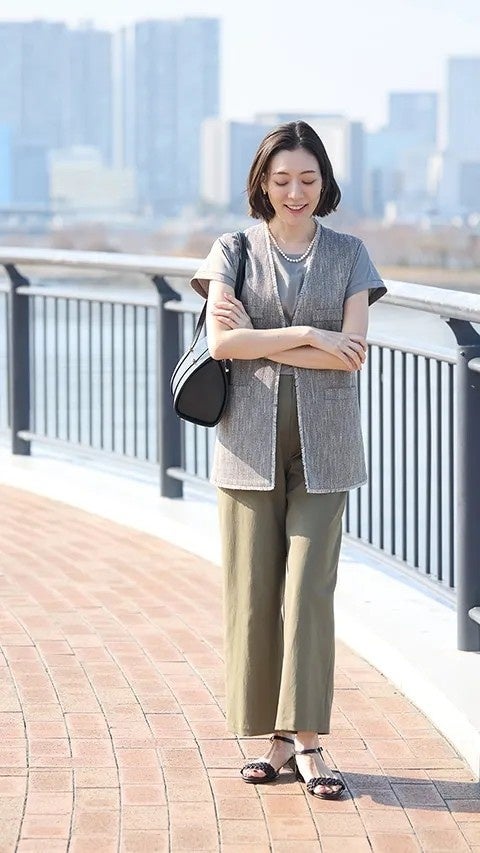 夏に頼りがちなカットソーのマンネリ防止には、ジレを1枚羽織って簡単に解決。いつものシンプルコーデが、一気にこなれた印象に。腰回りが隠れるやや長めの着丈なので、気になる部分をすっきり見せつつ、自然と縦のラインを強調できるのもポイントです。