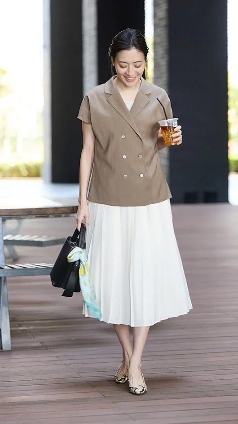 夏のオフィススタイルに重宝する、1枚で決まるデザインブラウス。Wブレストのジャケットのようなディテールとニュアンスカラーが、大人に相応しい品の良さを演出します。ボトムにはトップスを魅力的に引き立たせるプリーツスカートを合わせ、退勤後の予定もOKな華やかなお仕事スタイルの完成。
