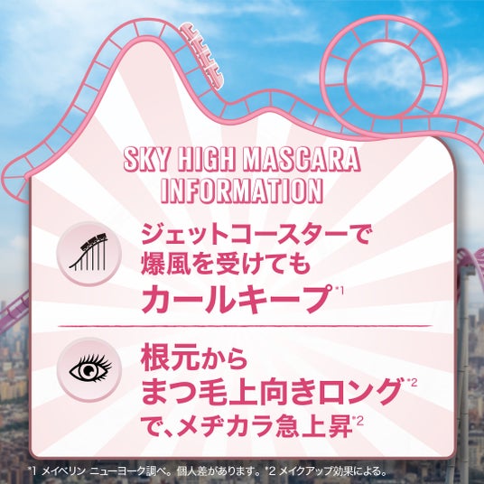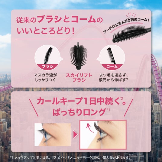「スカイリフトブラシ」の魅力を最大限に引き出す「リフトロックフォーミュラ」。マスカラ液がしっかりつくのに、重ね塗りしてもダマになりにくい。ジェットコースターの爆風でもカールキープ*²で、一日中*²美しい上向きまつ毛をキープ。