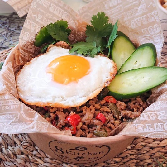 8kitchen本場タイで学んだ本格タイ料理のキッチンカーです。当店大人気メニューのガパオライスと自家製唐揚げの最強コラボ丼を限定販売いたします。この機会にぜひお召し上がりくださいませ。